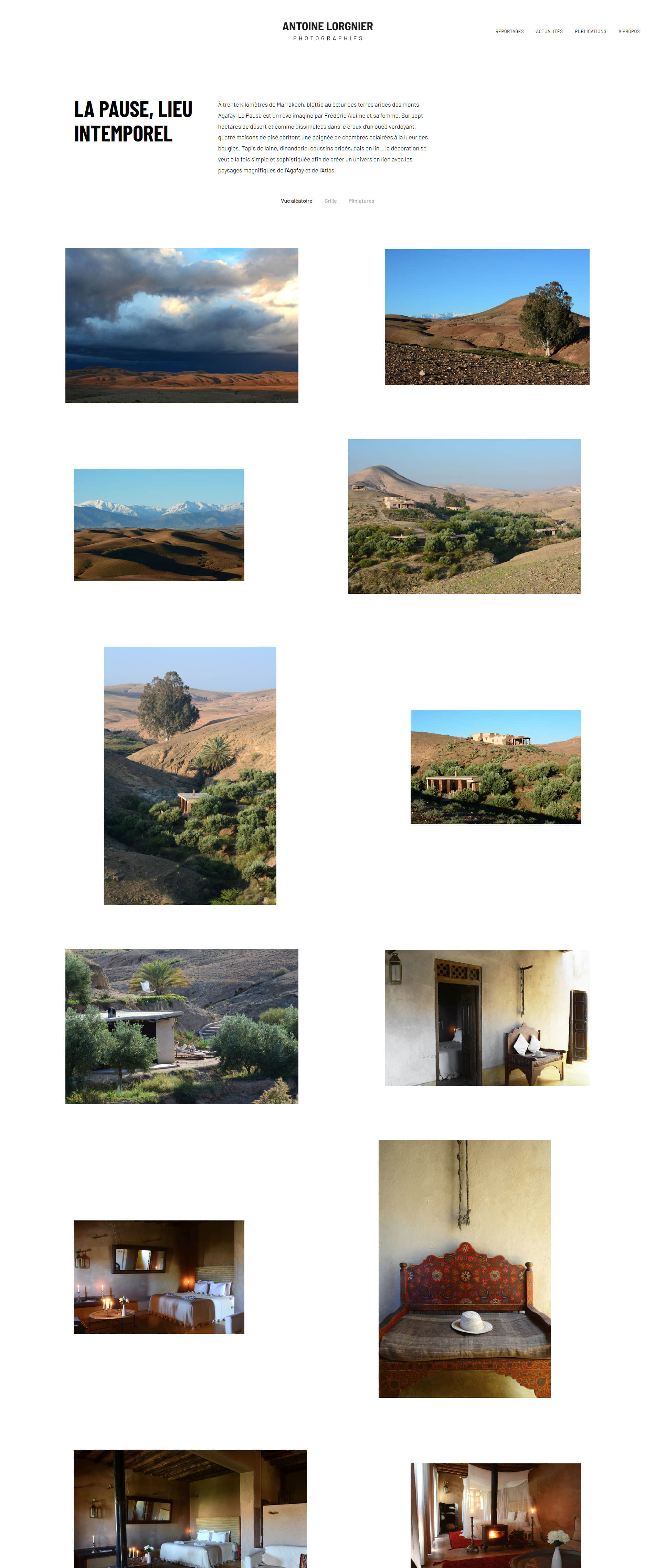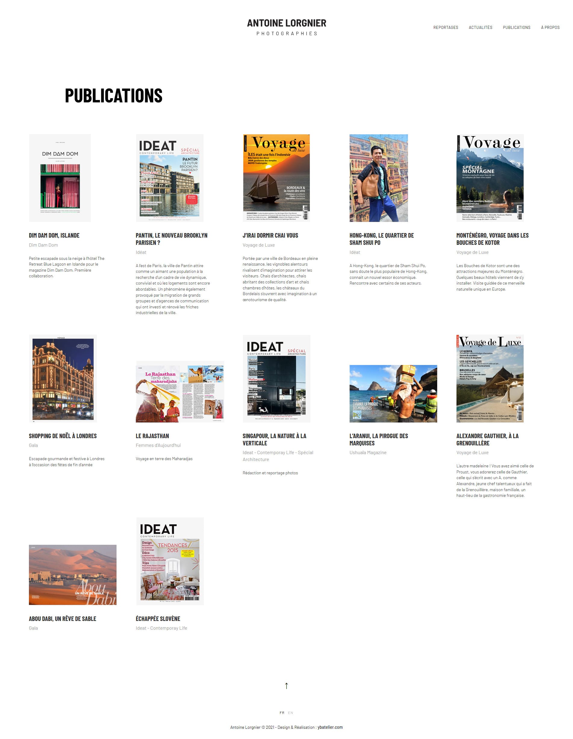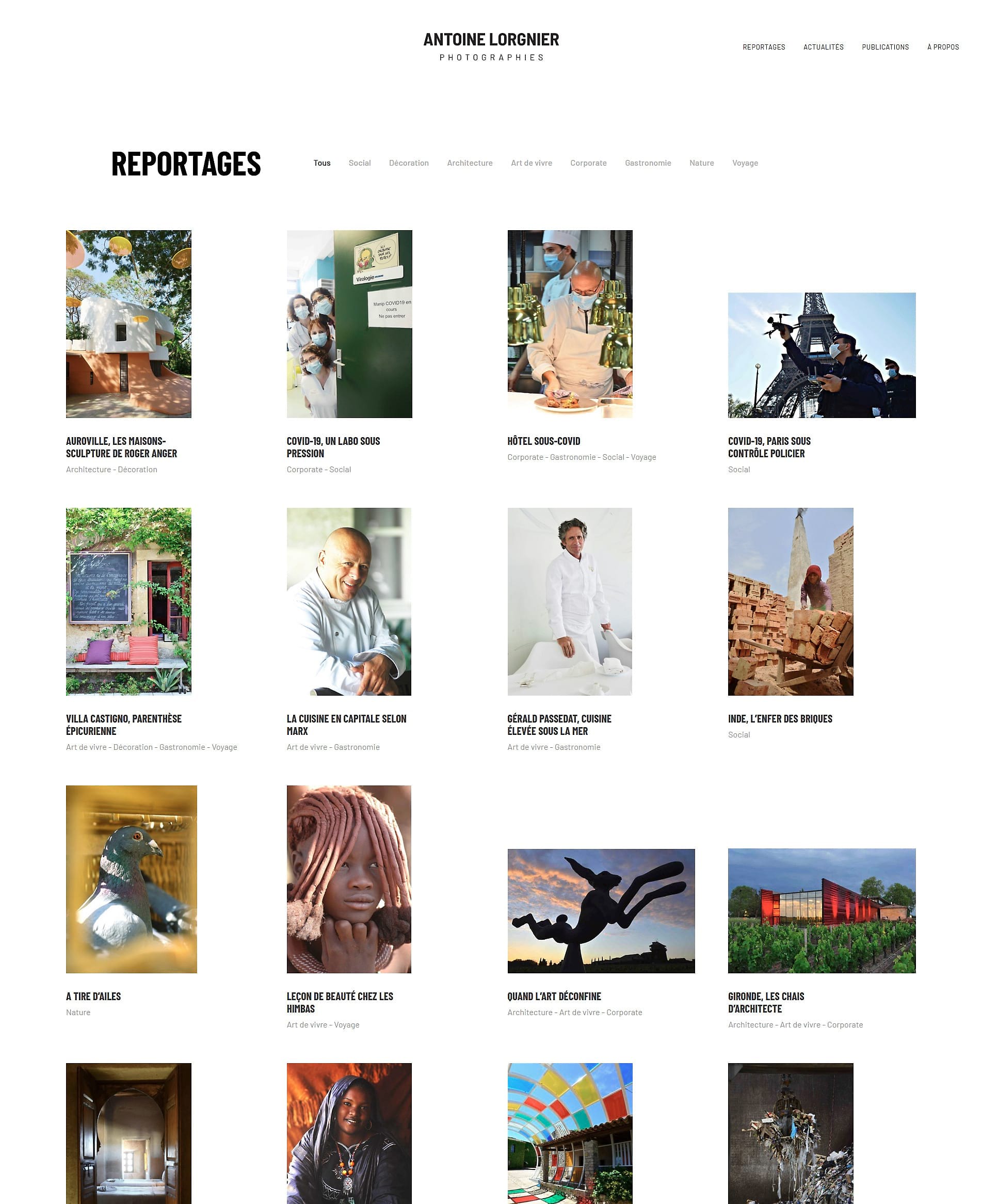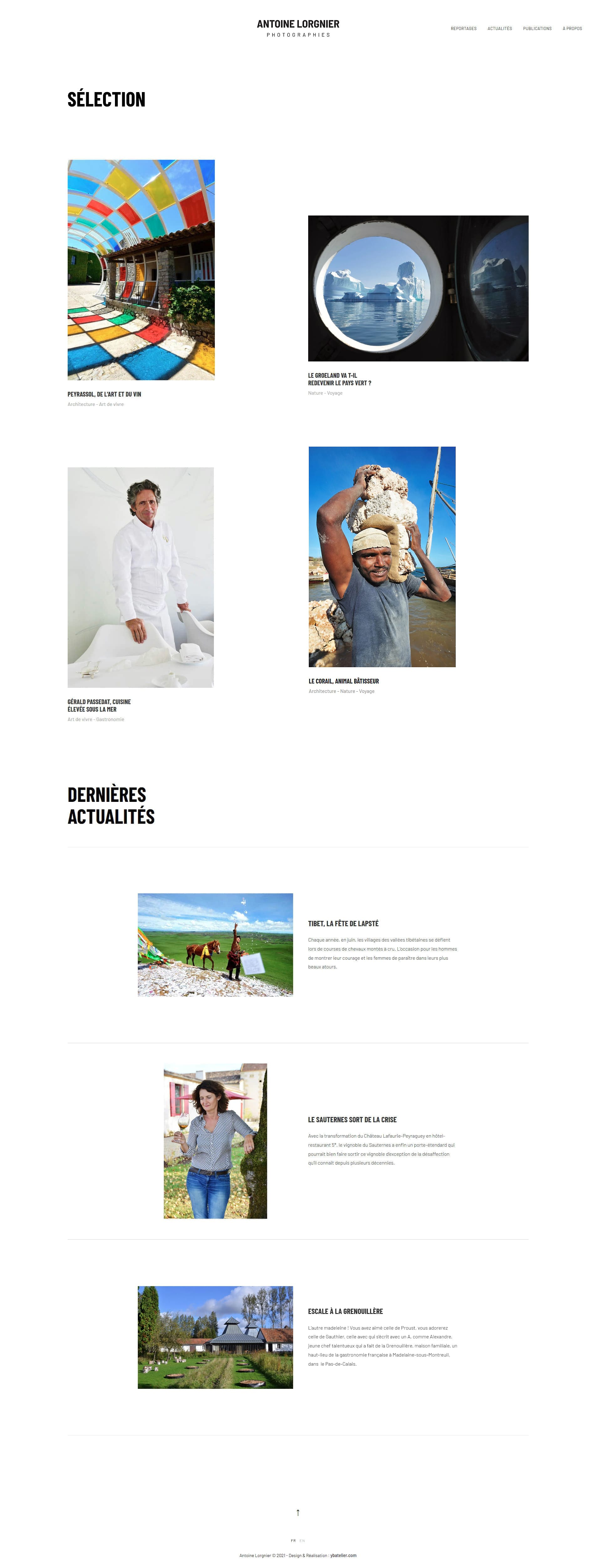 À la fois photographe et rédacteur, Antoine Lorgnier souhaitait un site multilingue français/anglais, minimaliste, élégant et fonctionnel afin de montrer les multiples facettes de son travail.