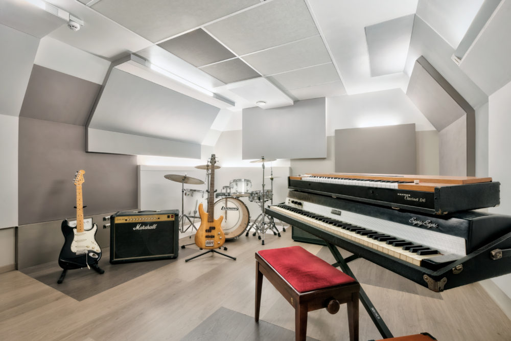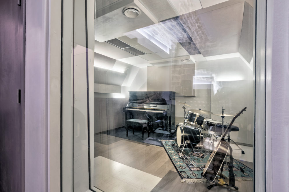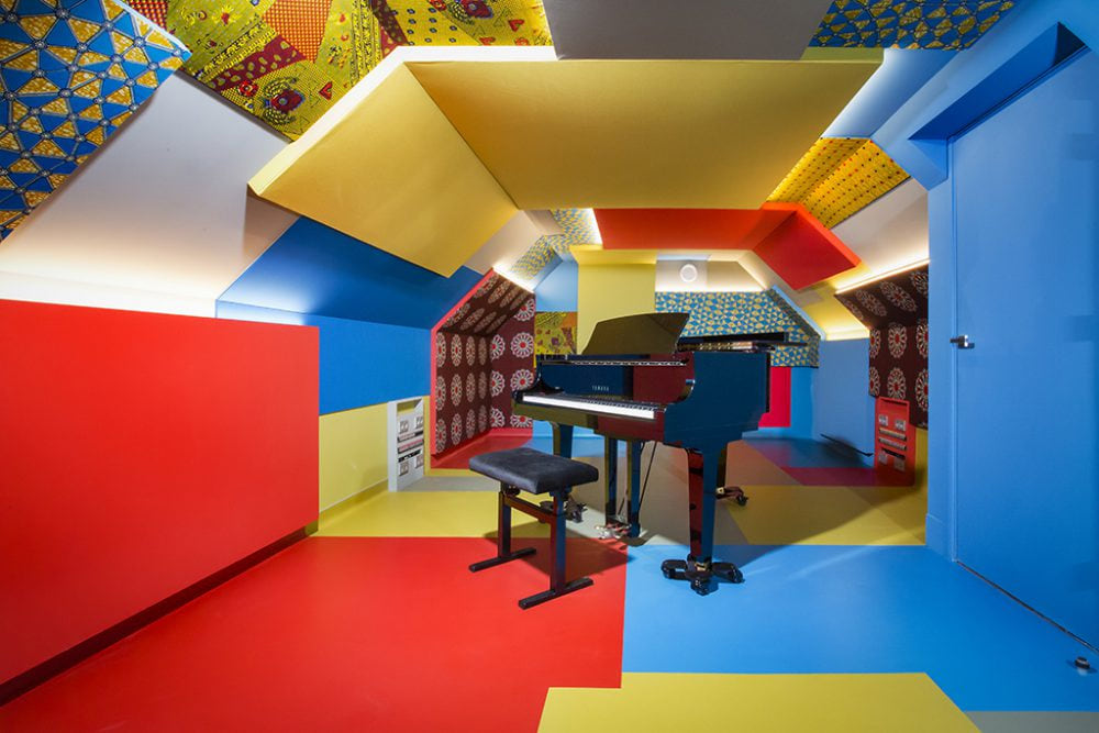Le challenge du projet a donc été de trouver un principe pour les deux structures qui sont étroitement liées et c’est tout naturellement que je me suis inspiré des couleurs vives décorant les cabines et régies du studio pour le design.