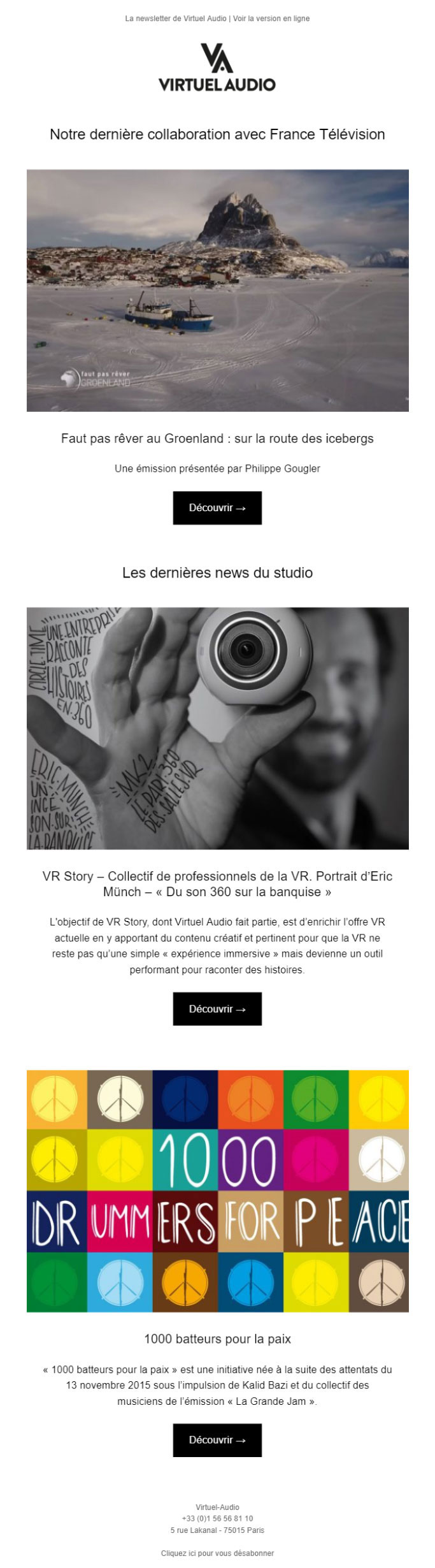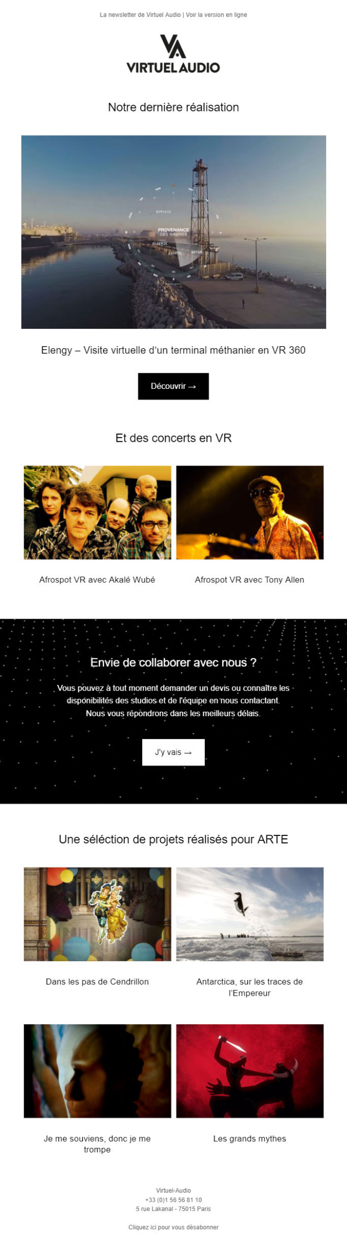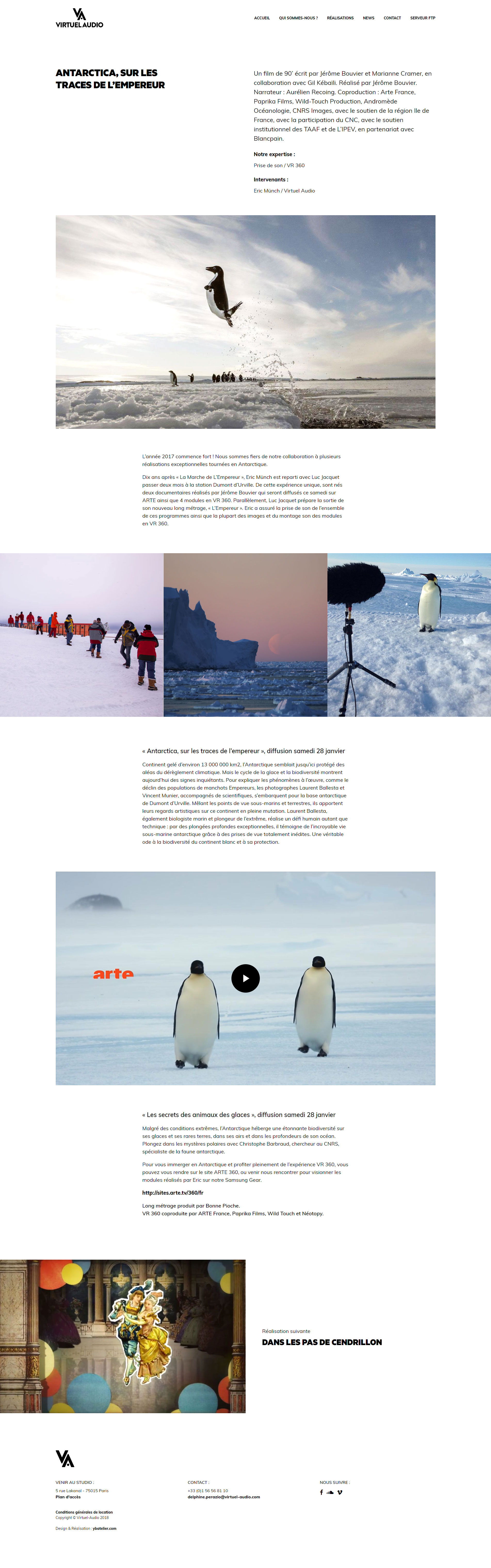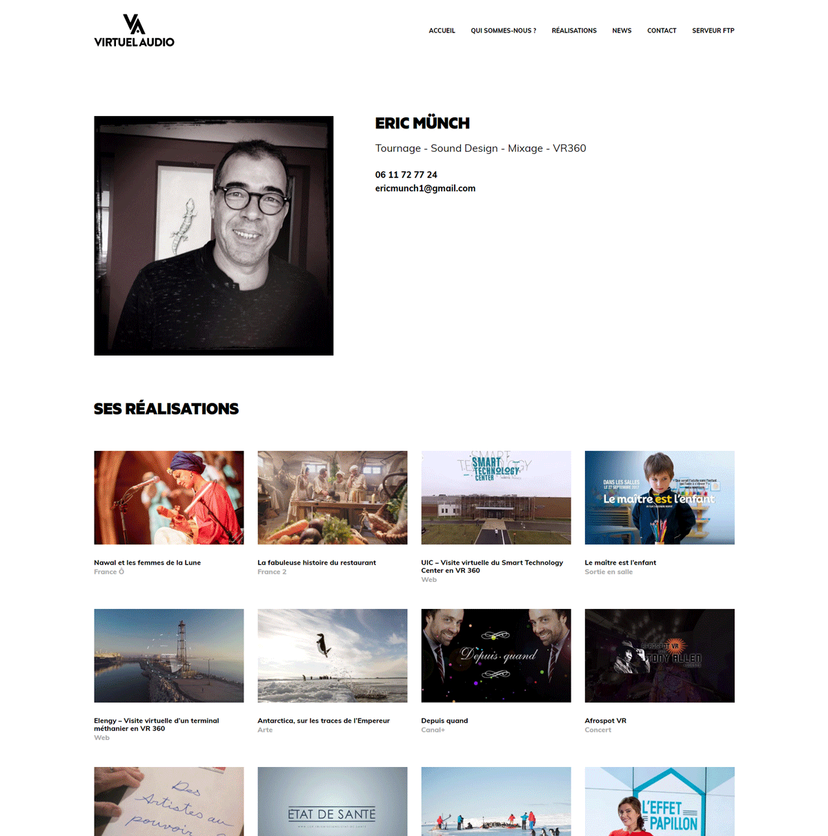 Le site est clair, adapté à tous supports et développé entièrement sur-mesure que ce soit au niveau du front que du back-end tournant sous WordPress : catégorisation des réalisations, pages spécifiques pour chaque membre de l’équipe incluant les projets auxquels ils ont participé, contenu modulable, lecteur de playlists musicales, lecteur vidéo personnalisé pour visionner la VR 360 hébergée sur YouTube ou sur le serveur, création de newsletters responsives directement via l’administration.